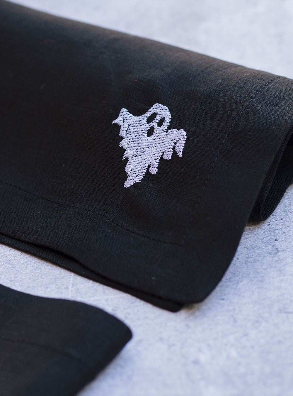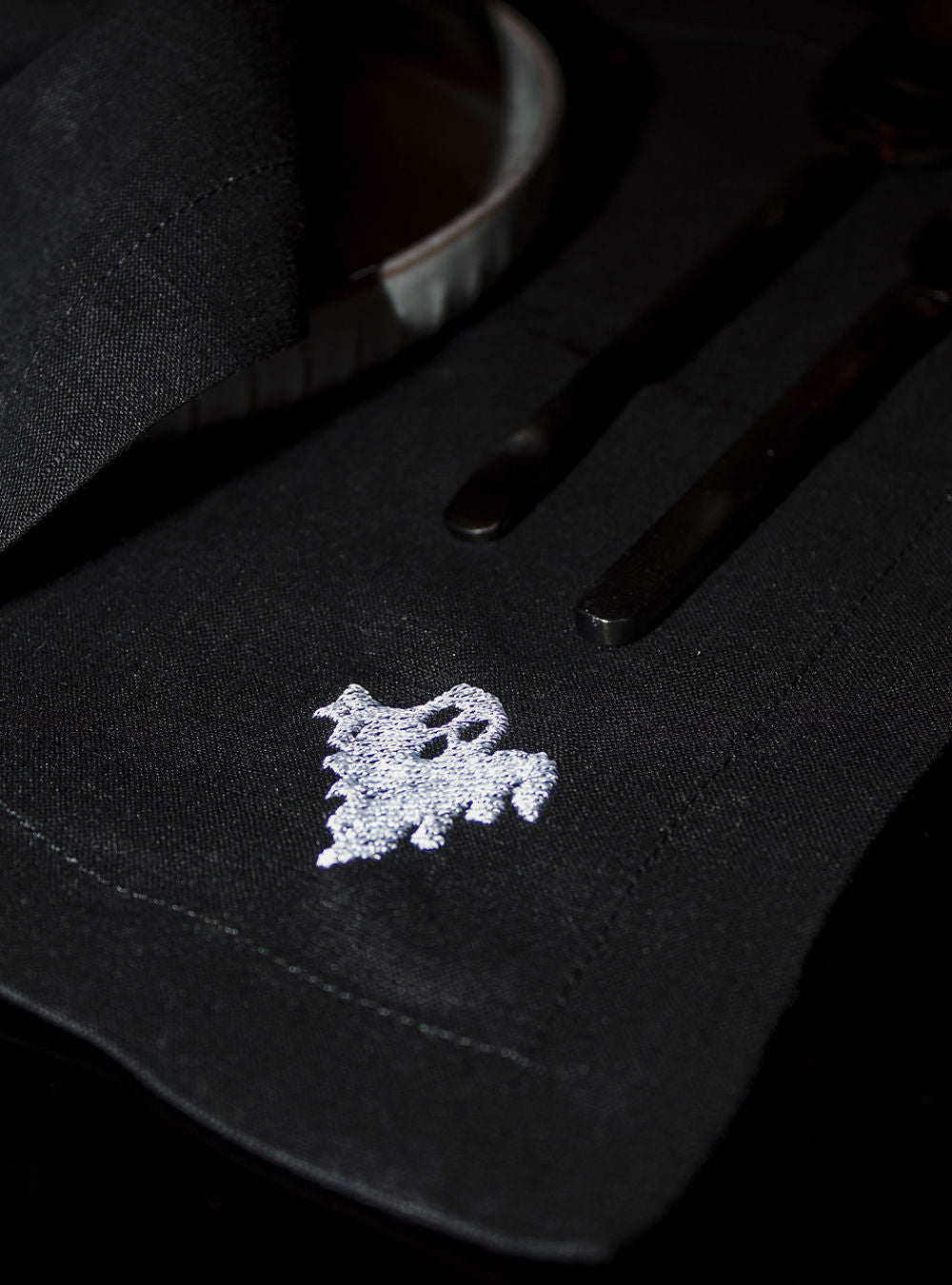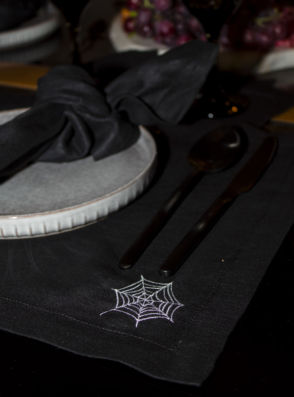 Mantel individual 100% lino con bordados especiales de Halloween. Discreto y elegante, viste tu mesa con un aire enigmático.